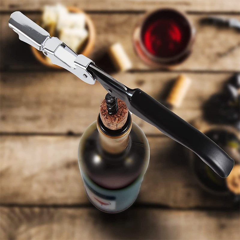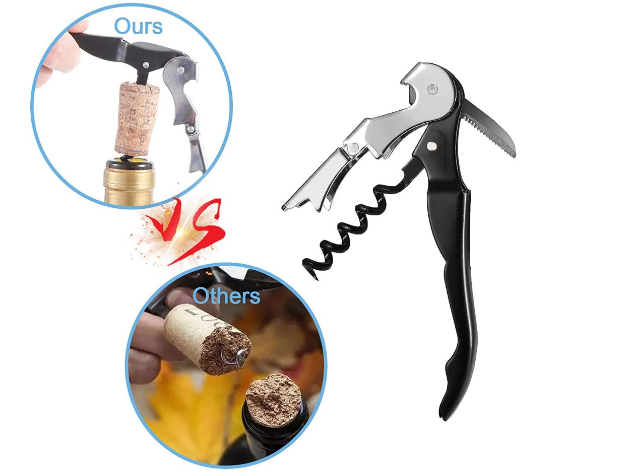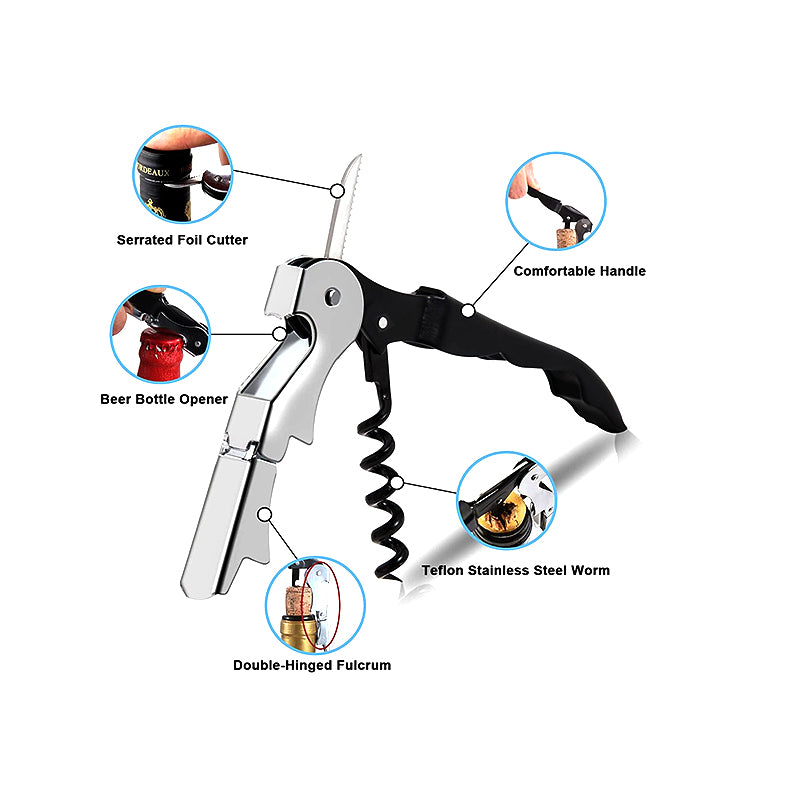 - MULTIFUNCTIONAL CORKSCREW: Wine opener has a classical double-hinged lever, the cork can be removed easily and efficiently. Using the foil cutter, reciprocate sawing the foil to remove the seal. Our wine bottle opener can also be a beer, soda, cola bottle opener.