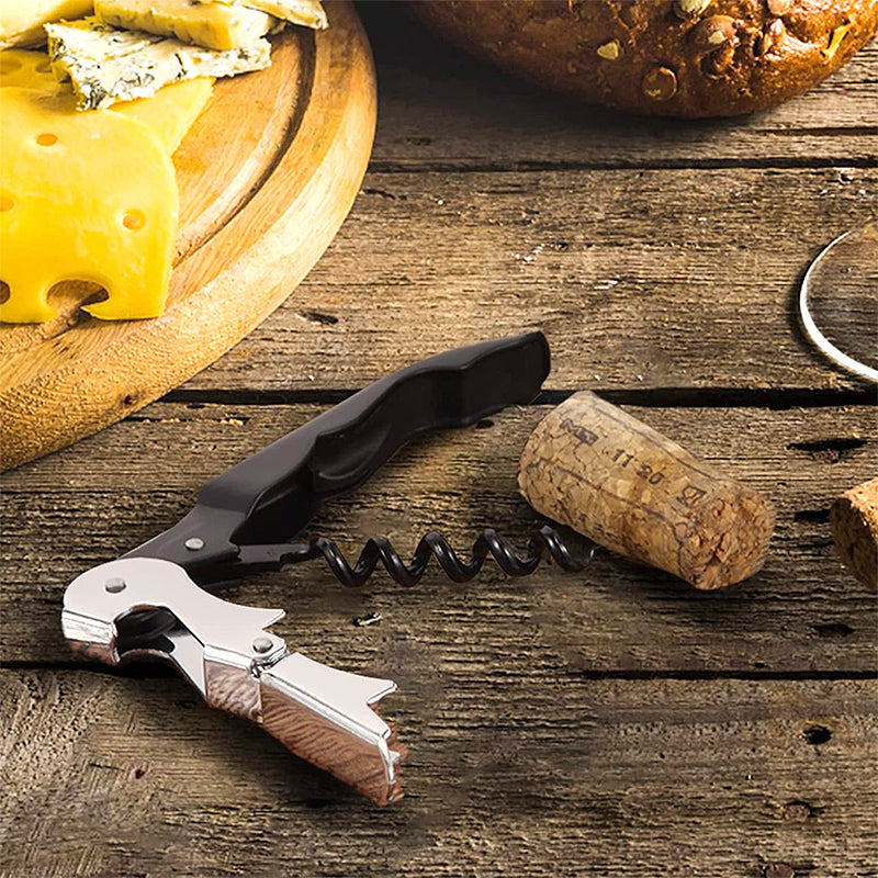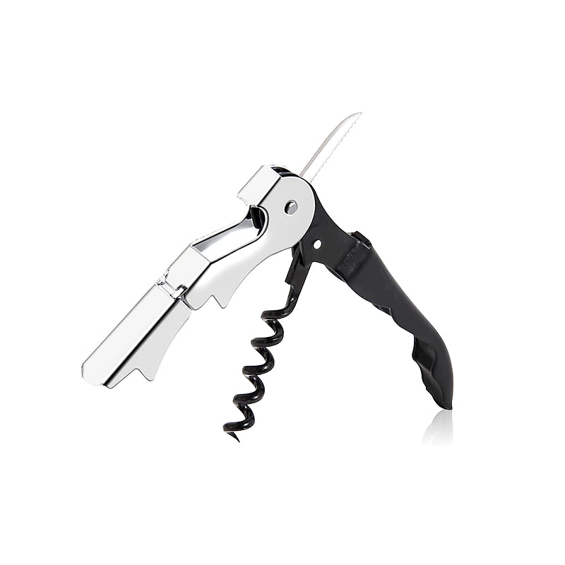 This 4-1/2-inch waiters corkscrew with a nonstick coating is a classic corkscrew design that has a foil cutter blade, a two stage cork lifter and bottle opener. Open a wine bottle by twisting in the screw, placing the openers shortest step on the top of the bottle lip and pivoting up the handle. After raising the cork partially, lower the handle to engage the longest opener step on the bottle lip then pivot on the handle to remove the cork from the bottle.